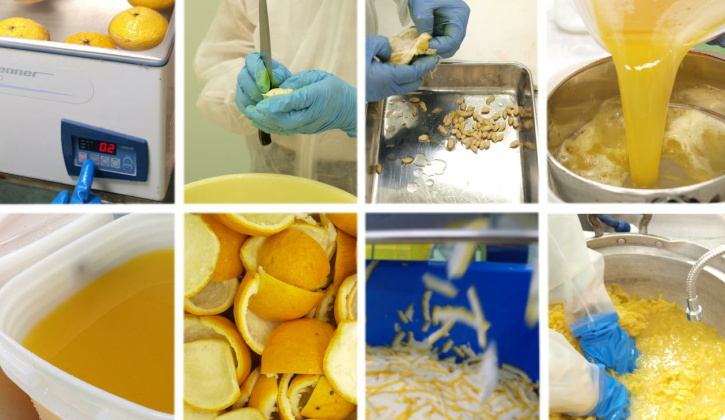 果実を生の状態から一次加工を行い、製品の原料として使用可能で、冷凍保管可能な状態に加工します。